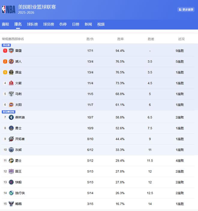 西部最新排名: